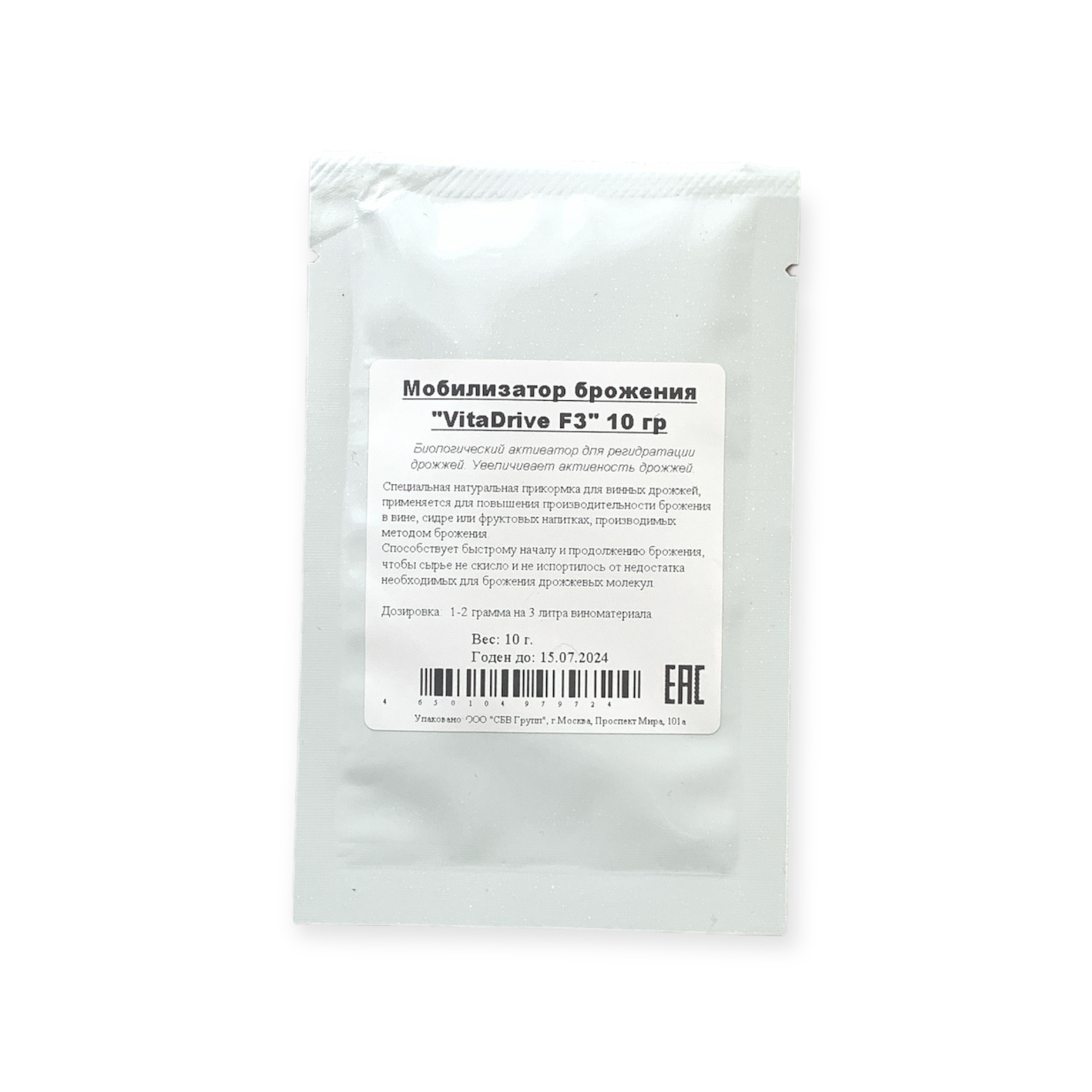 Мобилизатор брожения виноматериала VitaDrive F3 в фасовке 10 гр - специальная натуральная прикормка для винных дрожжей, применяется для повышения производительности брожения в вине, сидре или фруктовых напитках, производимых методом брожения. Способствует быстрому началу и продолжению брожения, чтобы сырье не скисло и не испортилось от недостатка необходимых для брожения дрожжевых молекул.